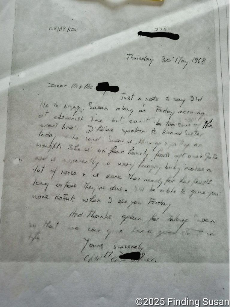 Just a note to say I’d like to bring Susan along on Friday morning at elevenish time, but I can’t be sure of the exact time. I have spoken to Ward Sister today who said Susan is putting on weight, still on four hourly feeds of cow & gate and apparently is a very hungry baby, makes a lot of noise and is more than ready for her feeds long before they are due. I’ll be able to give you more details when I see you on Friday.